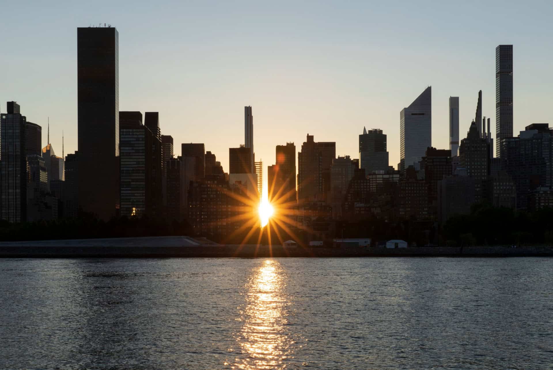 Le Manhattanhenge est un évènement qui se produit deux fois au cours de l’année, aux périodes où le soleil se couche parfaitement dans l’alignement des rues de Manhattan, une fois avant et une fois après le solstice d'été. On l’appelle aussi parfois le « Manhattan Solstice » 🤩